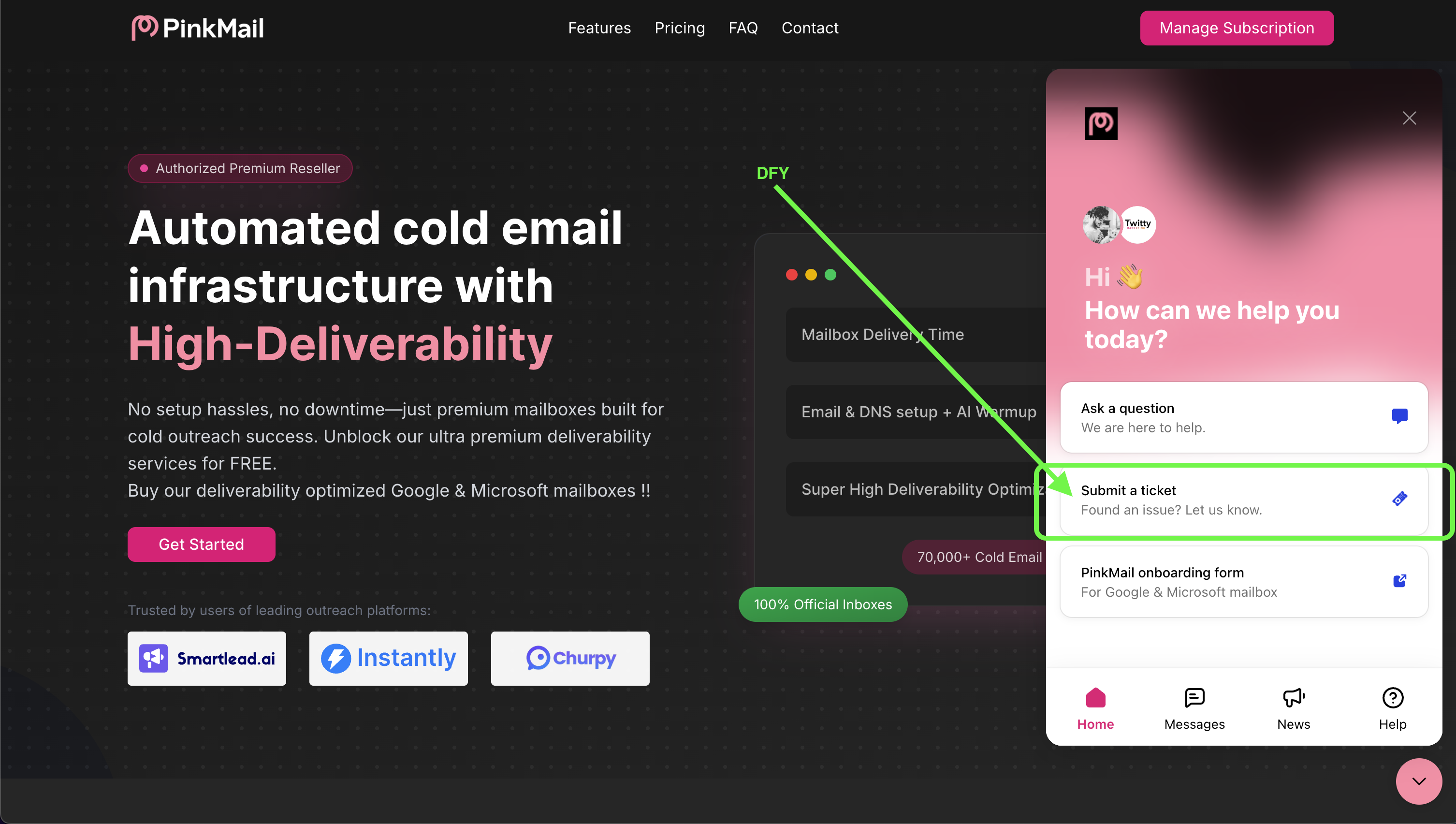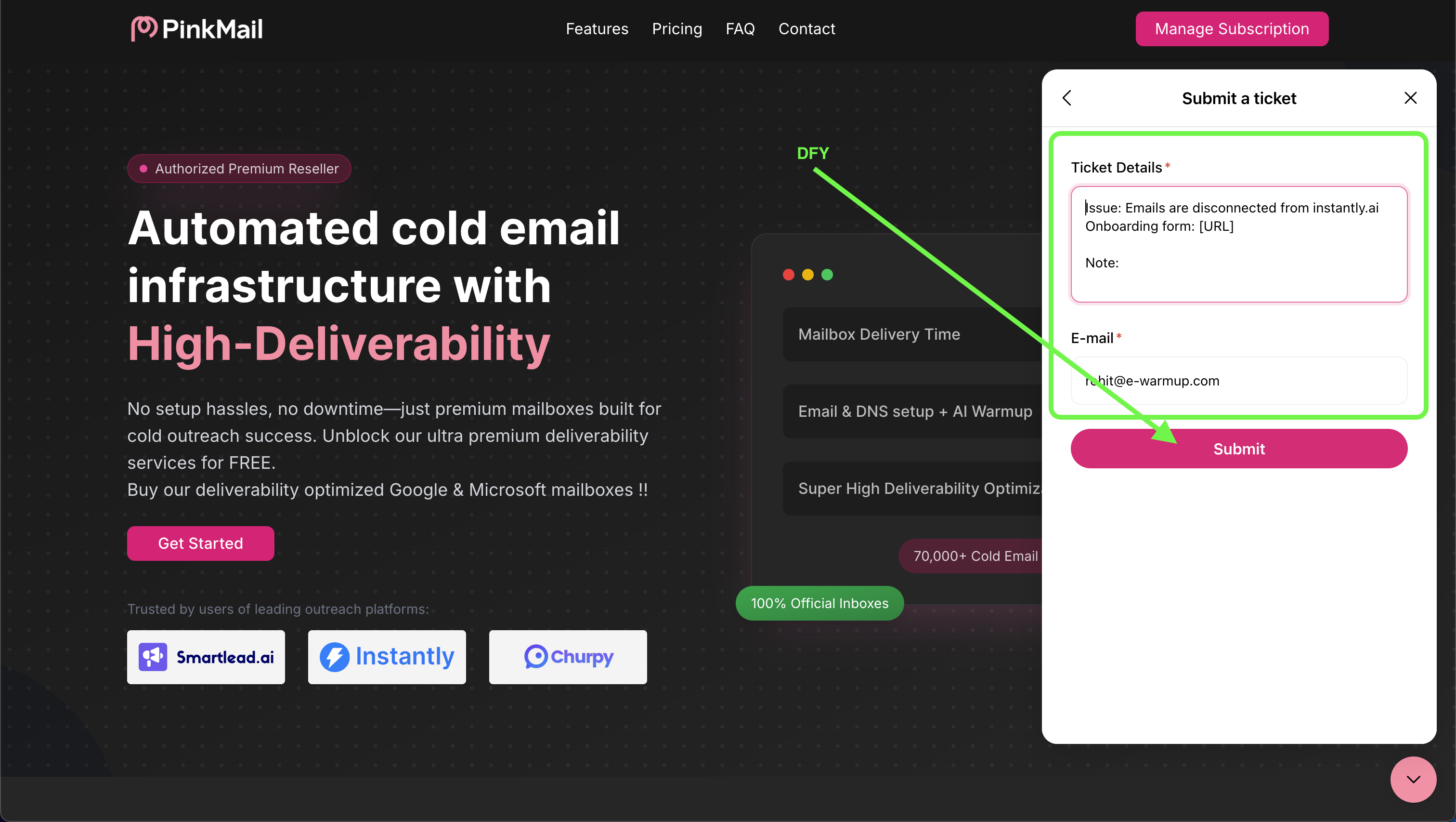 DFY (Done For You): You can submit a ticket through PinkMail.io’s LiveChat support to reconnect your mailboxes. Our team will resolve the issue as soon as possible. Steps to submit a ticket: